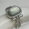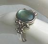 Der grünblauschimmernde Abalone hat einen Umfang vom 12x5 mm, und er ist in einer ausgesprochen schönen Silberarbeit eingefasst. Nur in Ringgröße 16 u. 17 mm