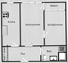 Die Wohnung verfügt über ein Wohnzimmer und ein Schlafzimmer. Die Wohnung ist nicht WG-geeignet und kann an eine bis zwei Personen vermietet werden. Es gibt eine vollausgestattete Küche und ein Bad mit WC und Dusche. Im Flur befindet sich ein großer, geräumiger Einbauschrank.