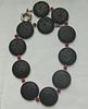 eine sehr auffallende, elegante Lavakette. Aufgefädelt sind Lavasteine in Discform. Farbenfroh präsentieren sich die nach jeden Lavastein eingefassten Korallensteine. Die sind jeweils von einem weissen Kristallstein gesäumt.