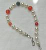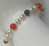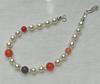 ein Edelsteinarmband mit den Edelsteinen Zuchtperle, rote Koralle, Karneol, grüner Heliotrop und einen Calzedon. Hinter jeden Edelstein ist zudem ein weisser Rocaille eingefasst.