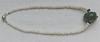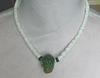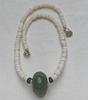 eine Edelsteinkette in der der weiße Friedensachat sowie ein Totenkopf aus massiven Moosachat, verarbeitet worden ist. Kunstvoll und plastisch schön ist der TotenkopfDer Friedensachat ist in unregelmäßigen Scheiben geschliffen, in einer Größe von 3/7 mm. Der Totenkopf , gleichfalls ein Achatstein, genau Moosachat, ist 26x20 im Umfang. Wunderschön kommen die Konturen des Totenkopfs zum Ausdruck.