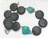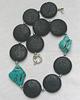 Eingefasst ist ein runder Lavastein, in Discform gechliffen, sowie zwei Türkissteine und silbergraue Magnetperlen.