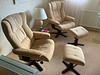 Microfaser/Alcantara Bezug, der Zustand der Sessel/Hocker ist T O P , keine Beschädigungen oder Flecken, kaum Gebrauchsspuren. Liegeposition ist möglilch. Die Füße sind aus massivem Nußbaum. Preisvorstellung je Sesseleinheit mit Hocker € 110,--.